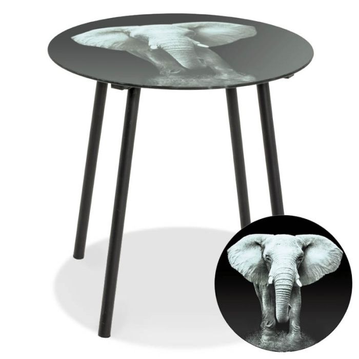 Schitterende glazen bijzettafel met unieke fotoprint van een olifant in zwart/wit.Uniek!! Het bovenblad is vervaardigd van 5mm dik gehard veiligheidglas (dus loei-sterk en ideaal in onderhoud !) in natuurgetrouwe under-print. Onder het under-print glasblad is een onzichtbare stalen kruis verlast (onwrikbare Triopos(c)-hotmelt), waarin u in enkele minuten de sierlijke pootjes stabiel monteert. De vier rondstaal pootjes zijn stijlvol, chique en topactueel in zijddeglans zwart gelakt.