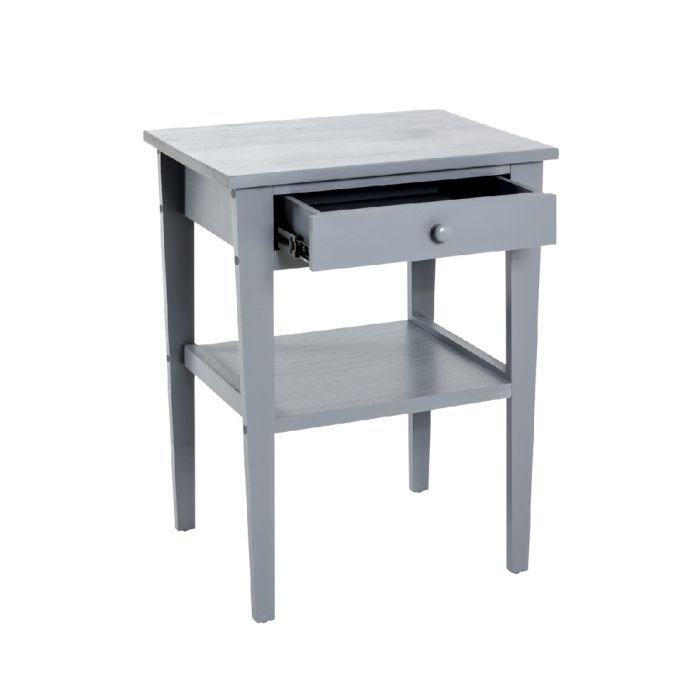 Fraaie bijzettafel met lade, vervaardigd van massief hout in strak grijs afgelakt. Deze bijzettafel heeft 'n practisch onderblad, en 'n lade, op soepele metalen telescoopgeleiding. Door de royale hoogte een uitstekend nachtkastje naast uw boxspring....