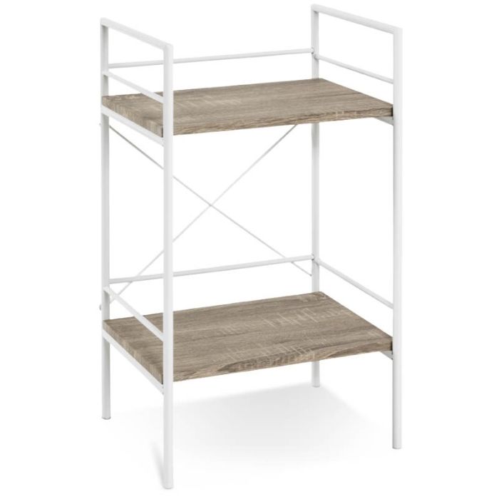 Stevige bijzettafel met practisch onderblad, vervaardigd van wit gelakt rondstaal met 2 bladen van 15mm dik MDF overtrokken met krasvast 3D Sonoma decor. Ook fraai voor in een smalle hal....