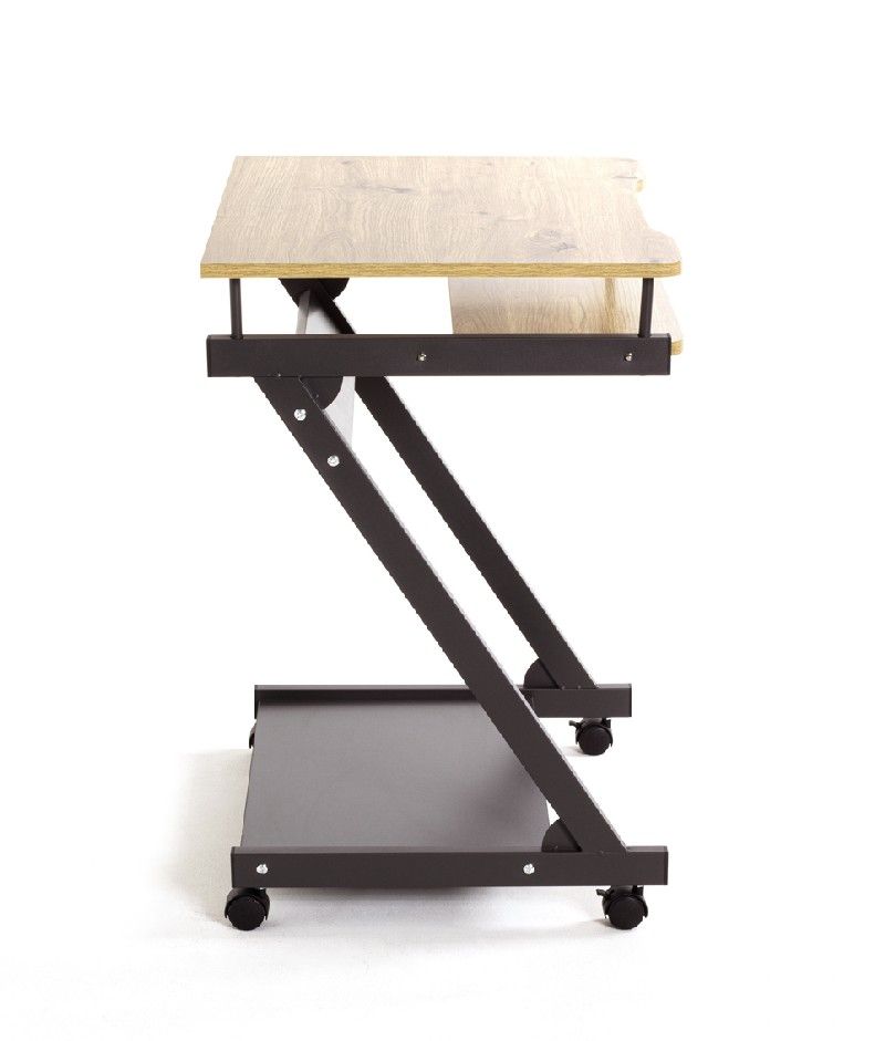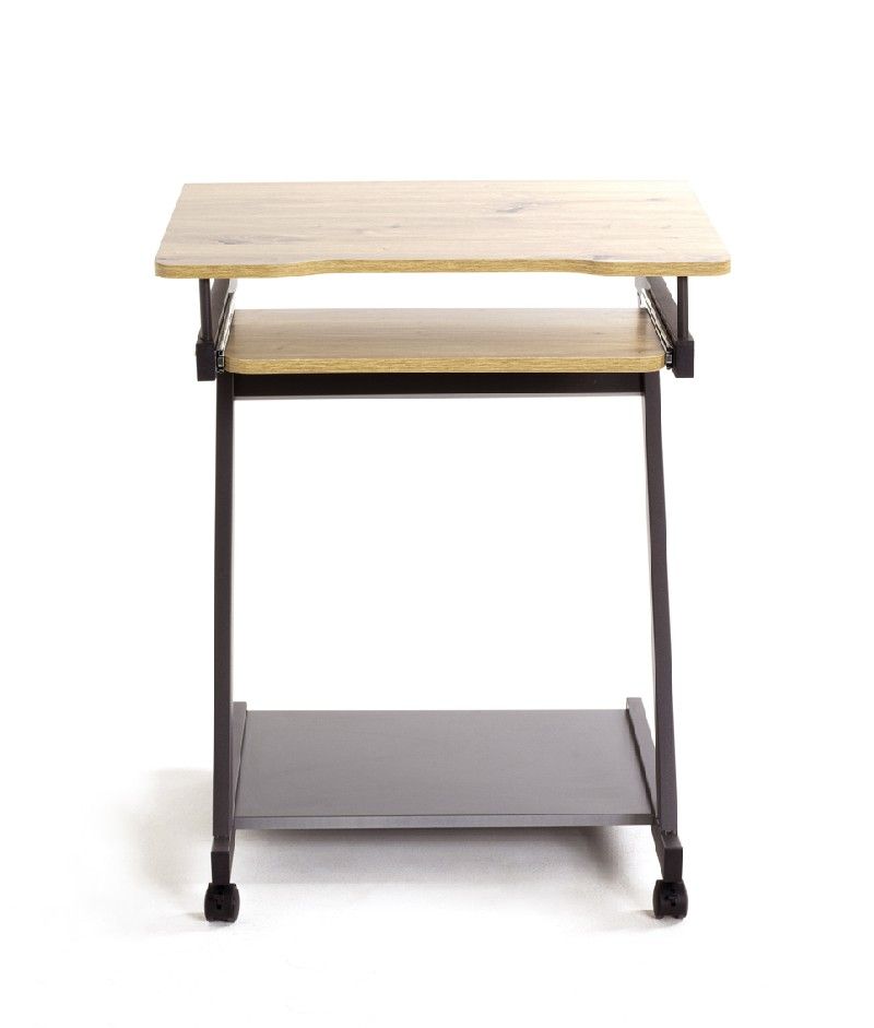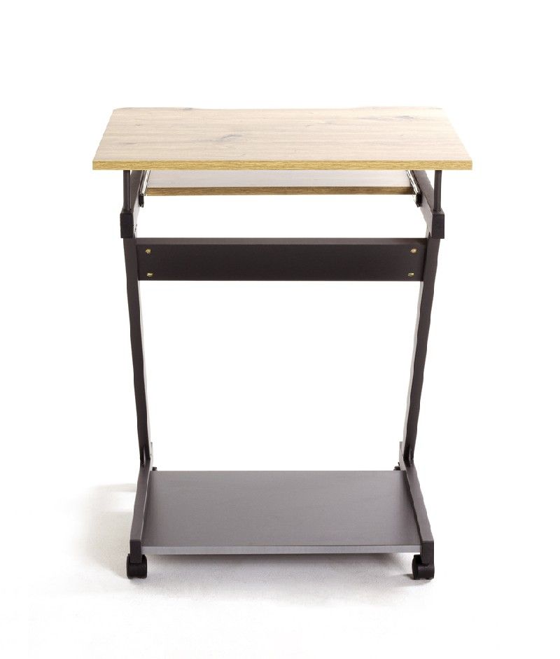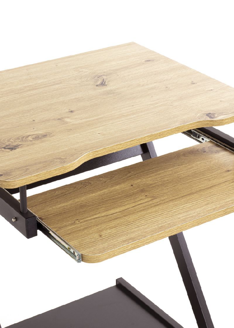 Slim, compact en practisch computerburo. Frame van sterk staal in antraciet. Met 3 bladen van Medite© MDF, afgewerkt in krasvast eiken-decor melamine. De afgeronde vormen maken het gebruiksveilig in huis of kantoor. De toetsenbord-plank is uittrekbaar en voorzien van soepele geleiders op kogellagers. Voorzien van 4 ruisloze wielen, waarvan 2 met rem.