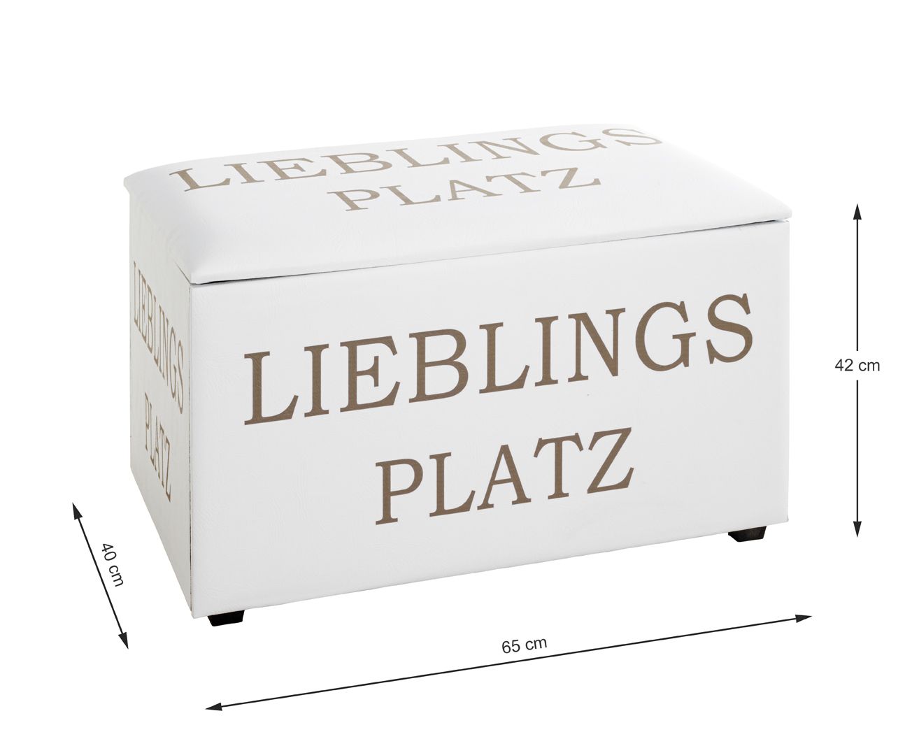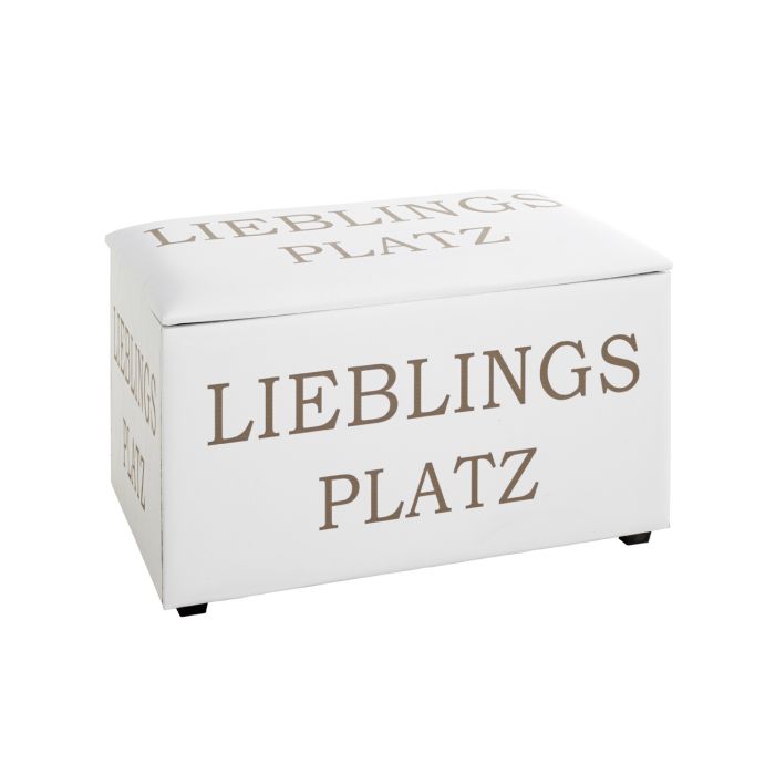 Spectaculaire Hocker-bank van zwaar MDF, met 'n zee aan practische bergruimte. Gestoffeerd met sterke kunstlederen bekledingsstof met comfortabele zachte onderlaag. De dekenkist heeft een afneembare deksel. De binnenkant is keurig gestoffeerd met stofvrije zwarte bekleding. De bank staat op 4 zwarte rubberen blokpootjes. De luxueuze leatherlook bekleding is in stralend helderwit met grijze opdruk Lieblings Platz aan 5 zijden…. Opberginhoud ruim 80Liter.