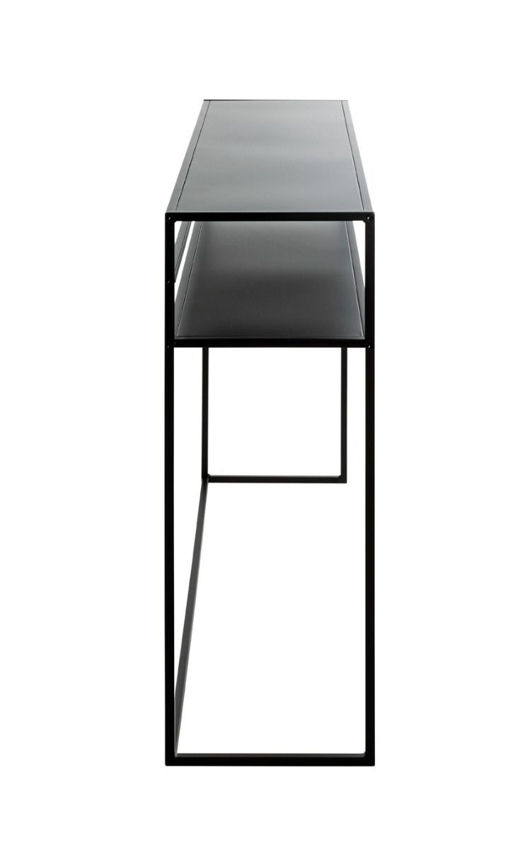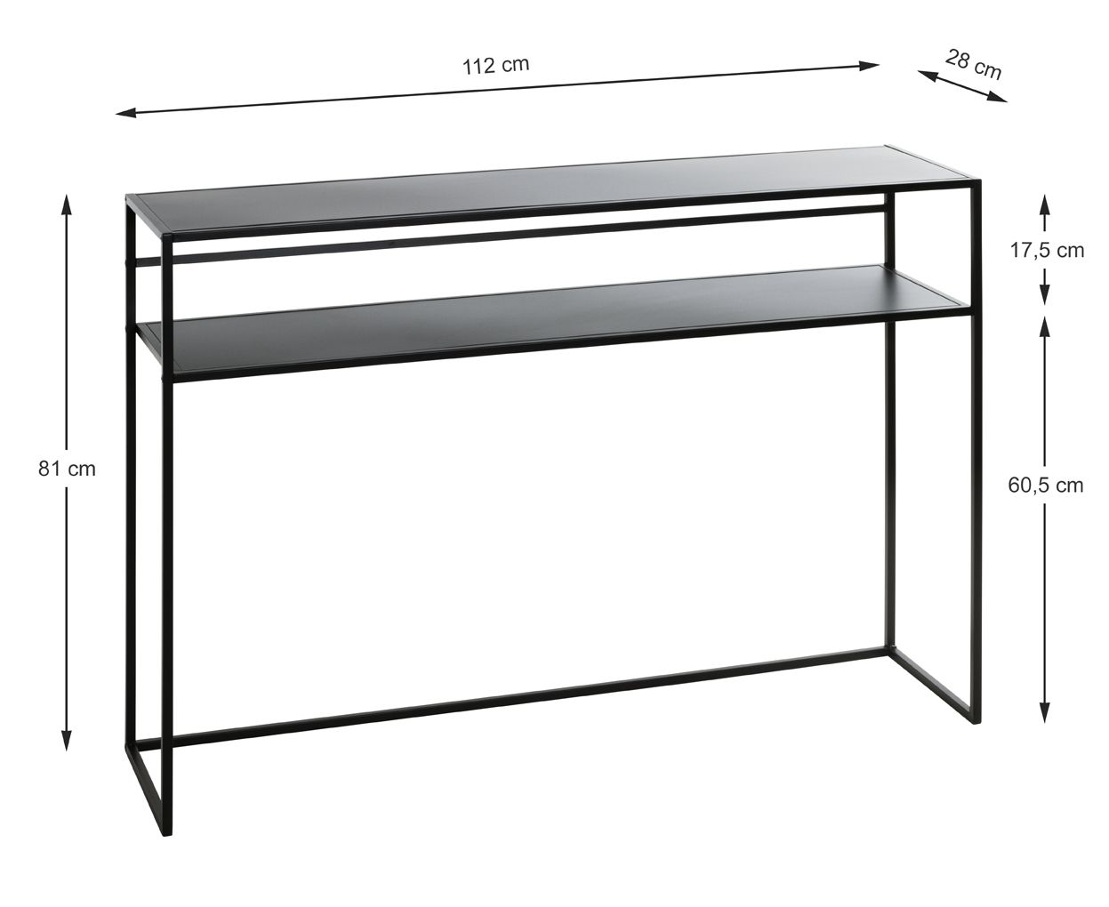 Zwart gelakte metalen hoge haltafel met extra opbergruimte door extra plank. De perfecte diepte van 28cm maakt het een ideaal meubel voor tegen de wand in een smalle hal. De tussenruimte tussen vloer en de bladen is 60,5 en 17,5cm. Tópdesign…