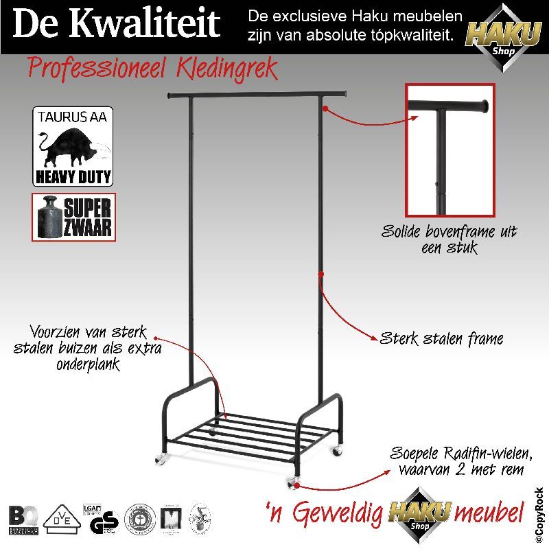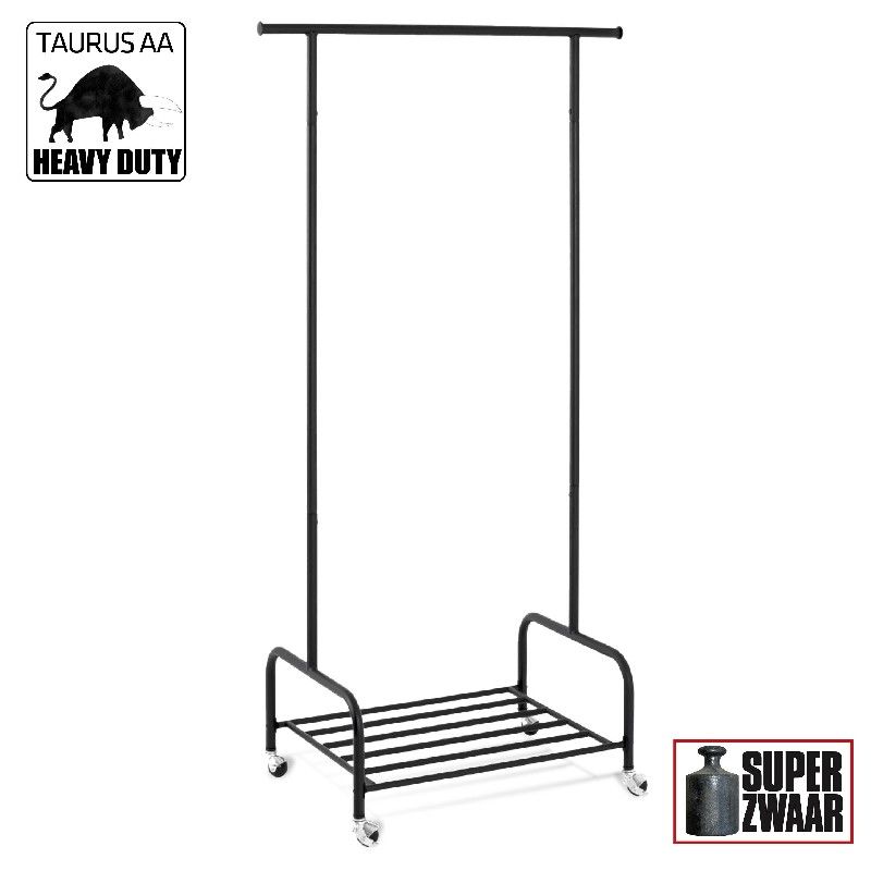 Zwaar kledingrek voor professioneel gebruik. Sterke stalen buisconstructie in poedercoated zwart gespoten. Uiterst solide verankerd. Voorzien van sterk stalen buizen als extra onderplank. Op onverwoestbare soepel Radifin-wielen, waarvan 2 met rem.