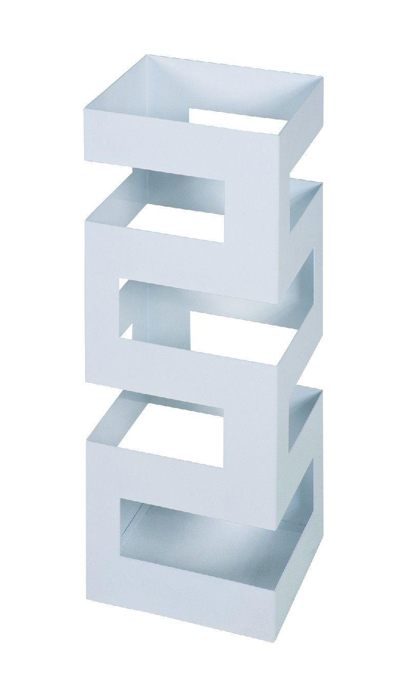 Spannend vormgegeven paraplubak van kunstig gefreesd staal, fraai gemoffeld in zijdeglans wit. 'n Geweldig stuk design… Voorzien van een uitneembare transparante kunststof lekbak; eenvoudig te reinigen.