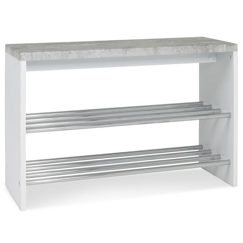 Riante schoenenbank van zwaar MDF in strakke witte lak, met 'n bovenblad in moderne Beton-optiek en met 2 rekken in verchroomd staal.