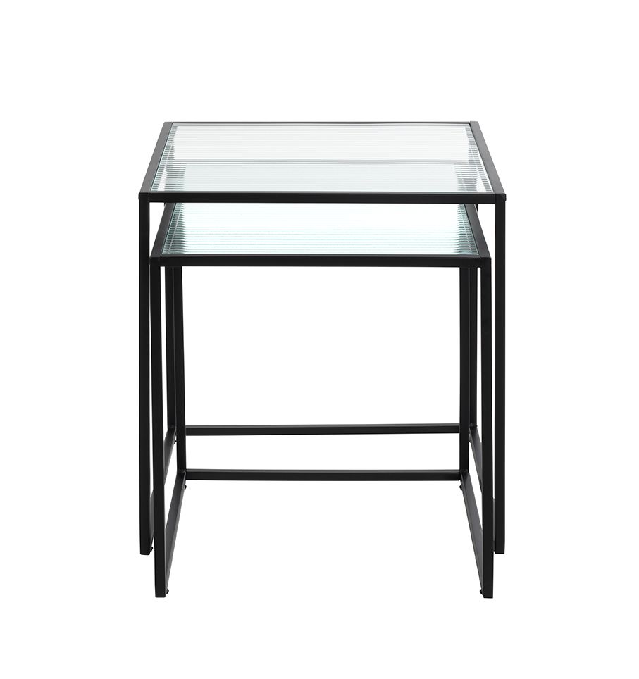 Strakke mimiset van 2 bijzettafels met frame van zijdeglans zwart gelakt staal, met bladen van golvend, transparant veiligheidsglas. Bovenkant van de transparante bladen is vlak afgewerkt.