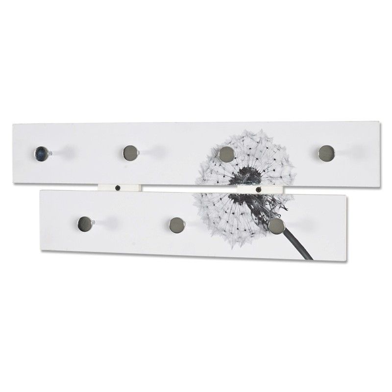 Fraai gedecoreerde wandkapstok met opdruk van een paardebloem. Vervaardigd van sterk MDF in Polarwit glans afwerking. Met 7 ronde garderobehaken van RVS.