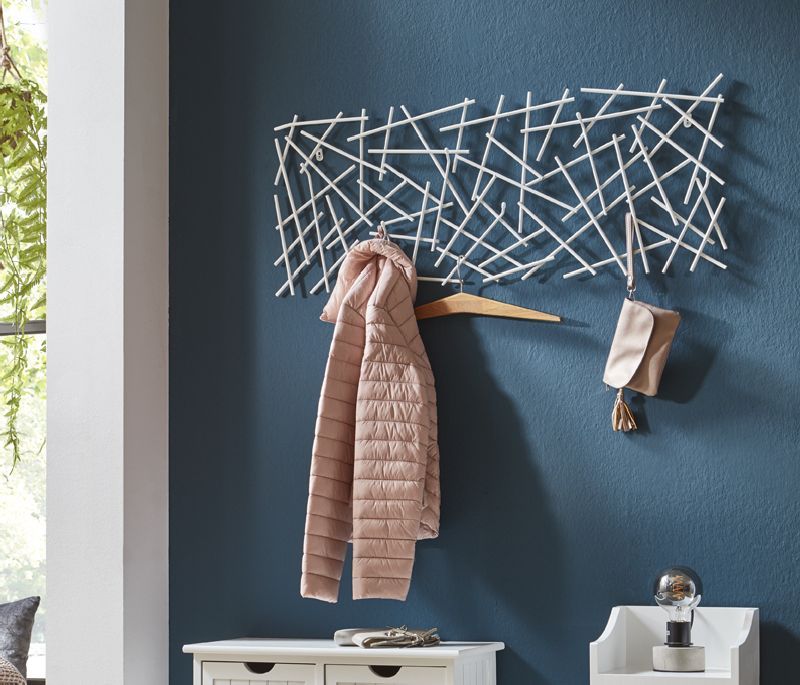 Origineel vormgeven wandgarderobe, die lijkt op de nonchalant uitgestrooide stokjes uit het Mikado-spel. Vervaardigd van sterk staal, in wit gelakt, met 6 garderobehaken. 'n Spectaculair lijnenspel, verrassend decoratief…