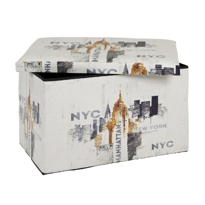Riante opbergkist, waar je ook heerlijk op kunt zitten. Voorzien van zachtgestoffeerd en afneembare deksel. Volledig gestoffeerd met kunstleder in vintage Manhattan NY print. Binnenkant keurig bekleed met zwarte stof en praktisch inklapbaar. Opberginhoud ruim 80Liter. Stoffering EcoTex(c)-100 kwaiteit, met MilieuKeur-merk.